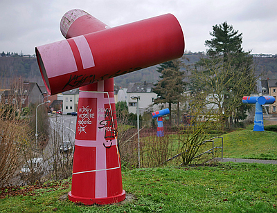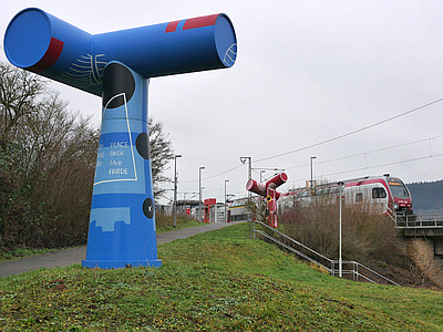 Darstellung der drei Richtungen des Schwebens: aufwärts, abwärts und horizontal; ursprünglich an der Saar aufgestellt, wegen Hochwassergefahr an den heutigen Standort versetzt. [1]