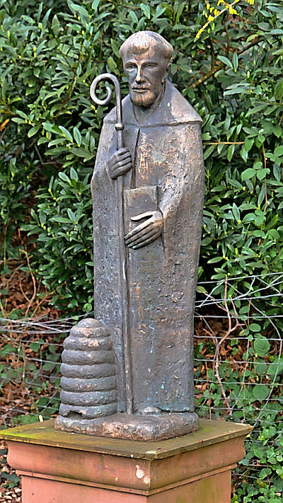Der Bildhauer Silvio del Antonio aus Wittlich schuf die bekrönenden Brunnenfigur: Sankt Bernhard mit dem Bienenkorb.