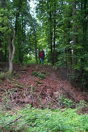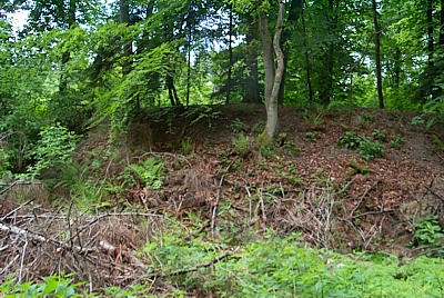 Die 2. von 3 Schanzen mit Laufgraben um den Höhenpunkt 421,9. In unmittelbarer Nähe des Hödeshofes an der Landesstraße 190
