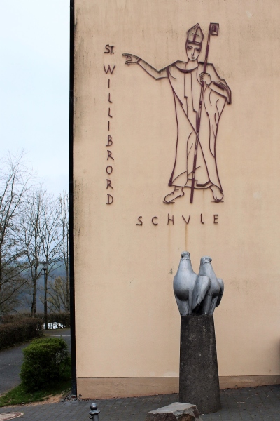Nach dem Abriss der Hauptschulgebäudes 2018 musste ein neuer Platz für die Plastik gesucht werden. Dieser fand sich an der benachbarten Grundschule unter der kunstvollen Silhouette des heiligen Willibrord, dem Namensgeber des 1963 vom damaligen Dechant Hammes eingeweihten Bauwerks sowie dem Patron des einstigen Dekanates Waxweiler. Entworfen wurde das metallene Bischofsbildnis von Malermeister Helmut Kremer aus Dasburg, angefertigt wurde es von Schmiedemeister Hugo Steffen aus Waxweiler. Ein zudem in der Schulchronik verzeichnetes Fresko mit drei Engelmotiven der Malerin Antonia Berning aus Weißenseifen existiert leider nicht mehr. [1]