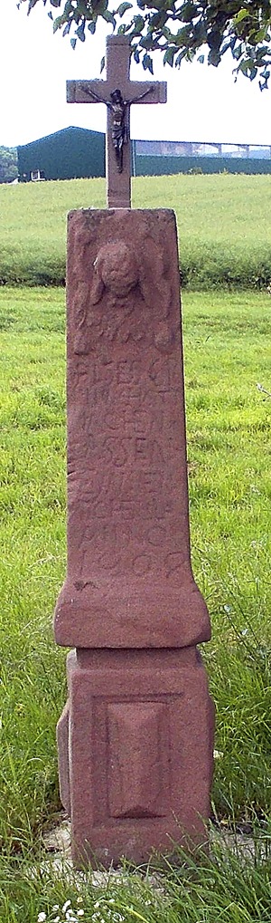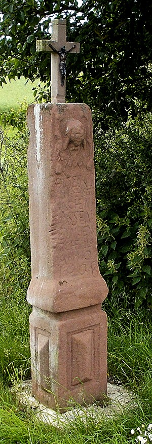 Im Südosten der Gemarkung steht der barocke Schaft eines Wegekreuzes mit ausladendem Fuß über einem Sockel. Unterhalb eines Engelskopfes ist er mit der Stifterinschrift, die 1708 als Aufstellungsjahr nennt, versehen. [1]