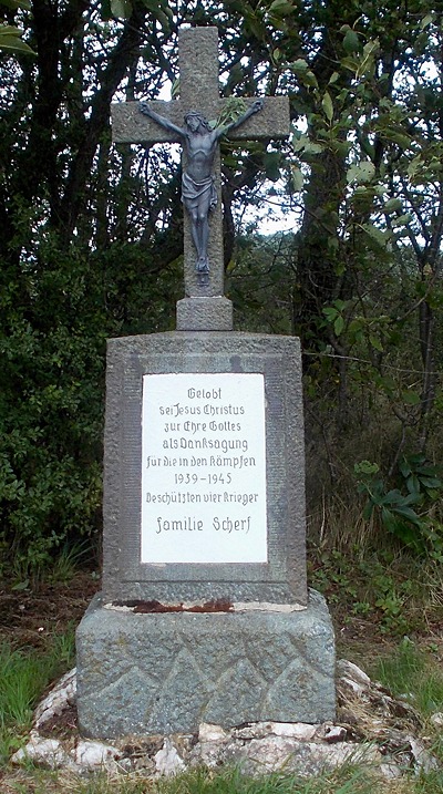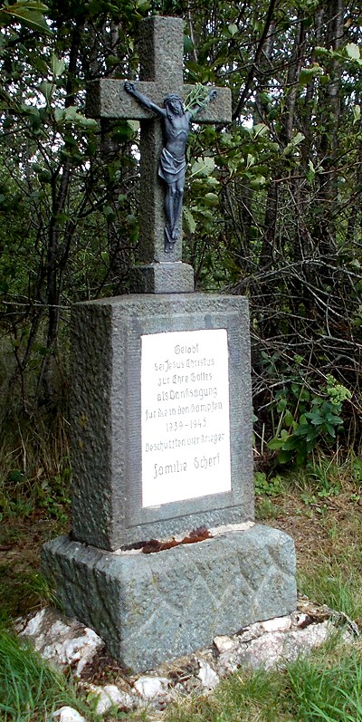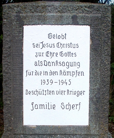 An der Straße von Bonerath zu den "Drei Mördern" steht etwa 500 m von der Bushaltestelle entfernt, an der linken Straßenseite ein Steinkreuz. Dieses, so entnehmen wir der Inschrift, wurde aus Dankbarkeit und in Erinnerung an den zweiten Weltkrieg von der Familie Scherf aus Bonerath aufgestellt.