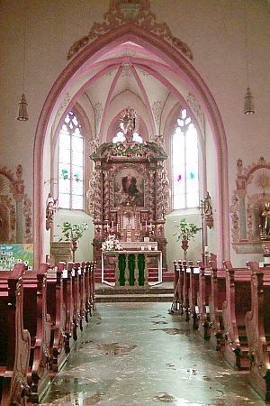 Chor, Joch und der Schluss um 1500. Langhaus und Westturm 1769 nach Plänen von Johannes Seiz durch seinen Bruder Andreas erbaut. Ausstattung der Erbauungszeit in reichen Rokokoformen. Monstranz um 1460 / 70. [1]