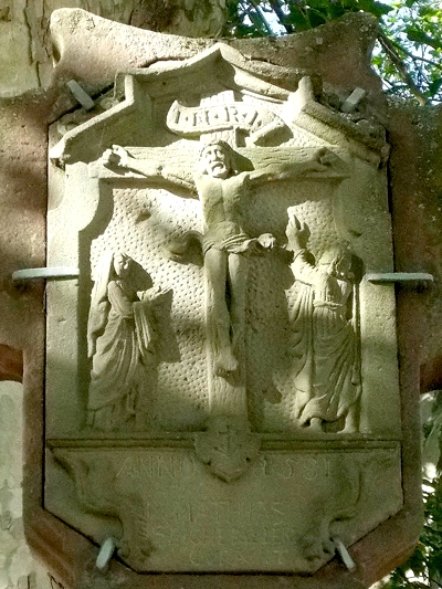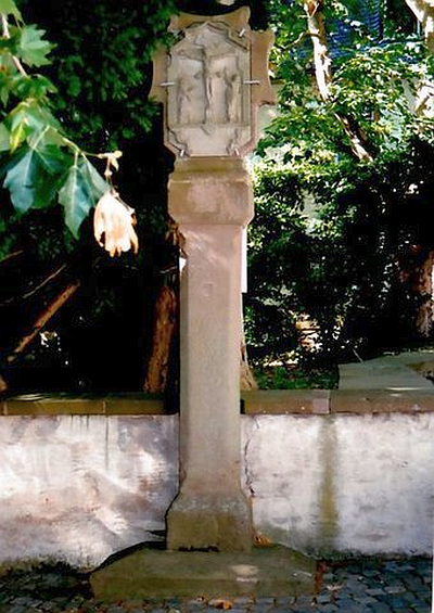 Hoher achtseitiger Schaft mit kreuzartiger Endung, auf der sich ein Relief der Kalvarienberggruppe befindet, darunter ein Wappenschild mit Hausmarke und der vierzeiligen Unterschrift: ANNO 1581. M. MATHIAS SPICHER FIERI CURAVIT. [1]