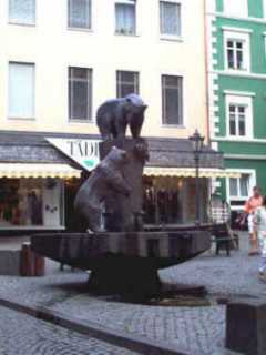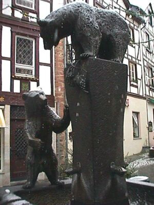 Einer Legende nach stammt der Ortsname Bernkastel vom Begriff Bärenkessel. So lässt sich auch der Bär im heutigen Bernkastel-Kueser Stadtwappen erklären sowie die Tatsache, dass man dem "Meister Petz" in der Stadt immer wieder un unterschiedlichsten Variationen begegnet. So auch hier als Brunnenfigur. Der Bildhauer Johannes Scherl verewigte das Wappentier gleich zweifach aus Bronze und erinnert damit an den historischen Bärenpütz: eine öffentliche Wasserzapfstelle mit gusseiserner Pumpe, die bis 1899 an dieser Stelle die Wasserversorgung der umliegenden Haushalte sicherstellte. Diese Pumpe wurde von einer Bärenfigur geziert, die heute vor dem Fenster am Haus Graacher Straße 25 steht. Schon entdeckt? [2]