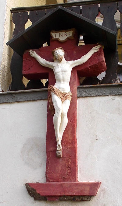 Abschlußkreuz eines früher an anderer Stelle, wahrscheinlich aber in der Nähe, gestandenen Wegekreuzes. Das in gepflegtem Zustand befindliche Steinkreuz zeigt die Hausmarke HR. [1]