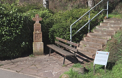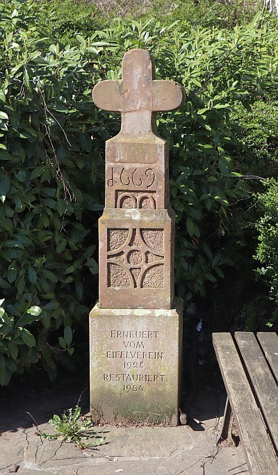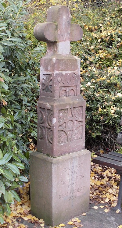 Das Mittelstück des Kreuzes war in einer Mauer, 50 Meter weiter rechts vom heutigen Standort eingemauert, wurde von der Ehranger Ortsgruppe des Eifelvereins ausgebaut, restauriert, mit neuem Sockel und neuem Kreuz-Aufsatz ergänzt und hier wieder eingebaut. [2]