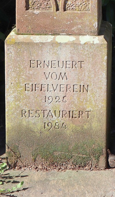 Der Eifelverein sorgte 1928 für seine Bergung aus einer Mauer und ließ es frei aufrichten. Zuletzt stand es freilich ohne Sockel und den Blicken entzogen tief im Damm der Trier-Koblenzer Bahn. 1985 veranlaßte der Eifelverein eine gründliche Restaurierung und die Erhöhung durch einen Sandsteinsockel.