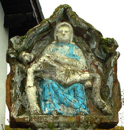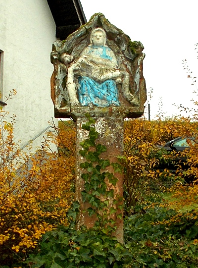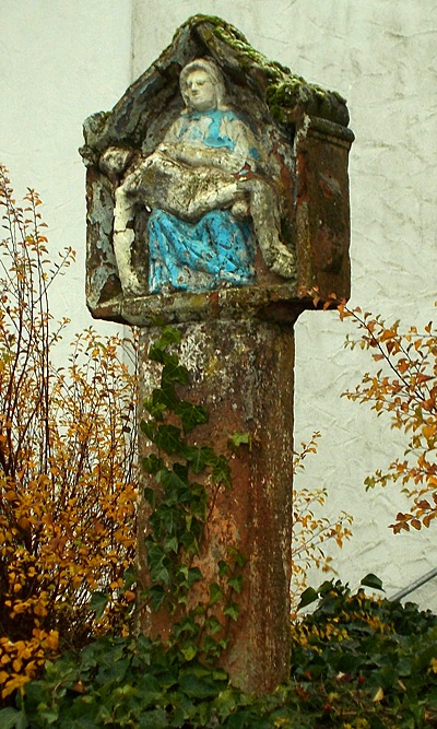 Bildstock mit glattem Schaft und barockem Nischenaufsatz mit Pietà, letzterer stark verwittert. [1]