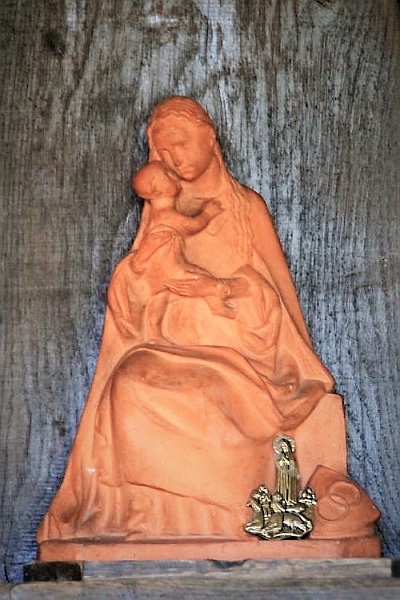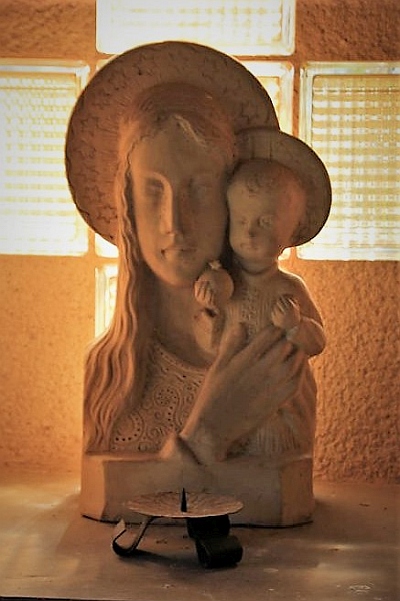 In der Kapelle steht auf einem Sandsteinaltar eine Madonna im hölzernen Strahlenkranz, die 1932 von Bildhauer Georg Metzen aus Spang noch für die alte Kapelle entworfen und modelliert und bei der Firma J. Plein - Wagner in Speicher gebrannt wurde. [2]