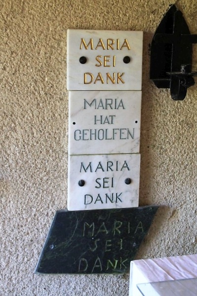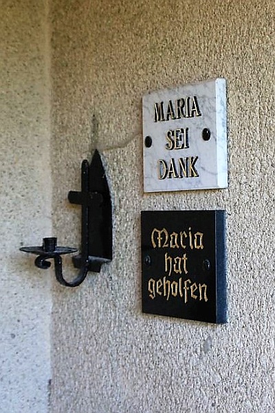 Es ist ein schlicht verputzter Rechteckbau mit weit überstehendem, schiefergedeckten Satteldach und rundbogigem Eingang. Die Seitenfenstern in Form des griechischen Kreuzes bestehen aus Glasbausteinen in antiker Farbe. Über dem Eingang befindet sich eine Sandsteintafel mit der Inschrift: Per Mariam ad Christum, und dem kombinierten Christus-und Marienzeichen. Auf dem Dach ist ein Doppelkreuz mit Schale und 4 Halterungen für Fackeln angebracht.