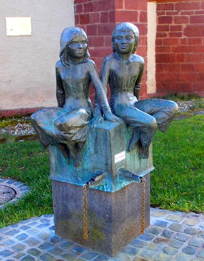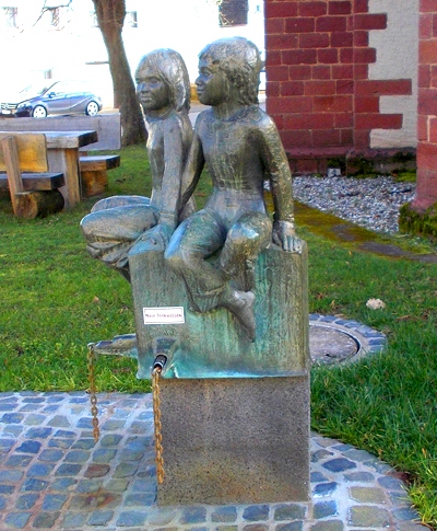 1975-76 von Bildhauer Hanns Scherl (1910-2001) aus Wittlich in Bronze geschaffener, mit Quellwasser gespeister Dorfbrunnen. [1]