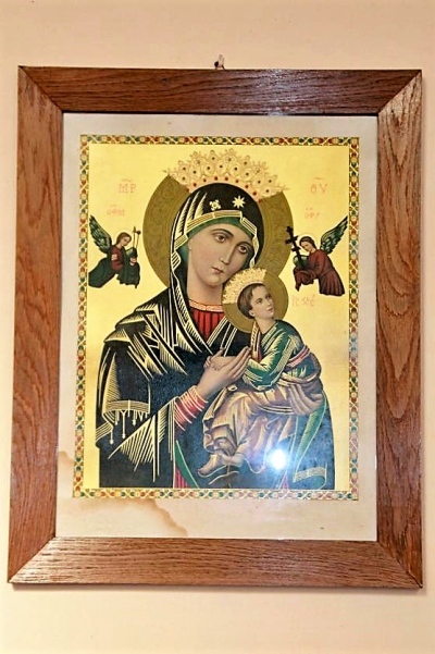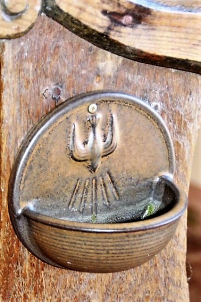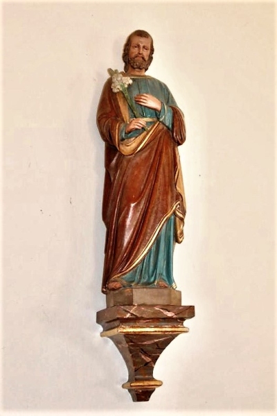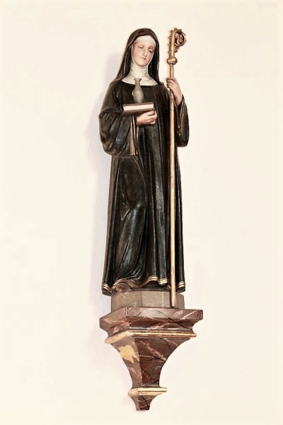 Die Kirche, vor der wir stehen, wurde in den Jahren 1847 bis 1849 erbaut. Oberhalb der Eingangstüre sind zwei ältere Steinfiguren eingemauert. Die obere stellt den heiligen Sebastian dar. Die andere Figur scheint die heilige Odilia, eine Äbtissin aus dem Elsass, zu sein, worauf das Buch und der Kelch, welche die Figur in den Händen hält hindeuten.