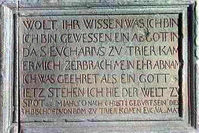 [1] Petrus Becker, Das Erzbistum Trier 8: Die Benediktinerabtei St. Eucharius-St. Matthias vor Trier (Germania Sacra N. F. 34), Berlin/New York 1996. http://hdl.handle.net/11858/00-001S-0000-0005-7455-E