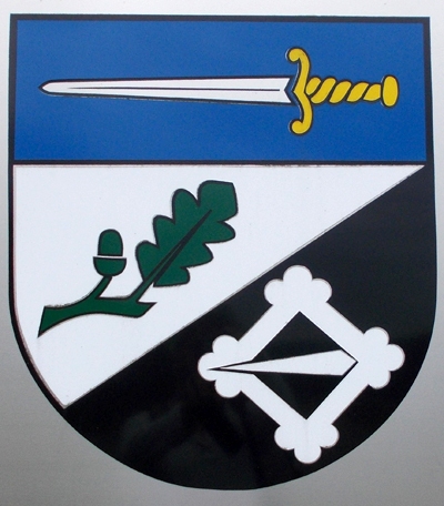 Unter blauem Schildhaupt mit silbernem, goldgegrifftem Schwert, von Silber über Schwarz schräglinks geteilt, oben ein grüner Eichenzweig mit Blatt und Eichel, unten eine rautenförmige silberne Gürtelschnalle. [1]