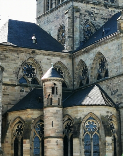 >> Erst wenige Jahrzehnte zuvor und nur rund vierhundert Kilometer von Trier entfernt war die Gotik erfunden worden, da kamen 1235 auch schon Baumeister aus Frankreich nach Trier geeilt und errichteten in nur dreißig Jahren einen der frühesten, rein gotischen Kirchenbauten Deutschlands. Doch einen Kompromiss gingen die französischen Meister in Trier ein: sie schufen einen Zentralbau auf dem Grundriß der Rosa mystica (als Rose bezeichnete man die Jungfrau Maria), für den es in der französischen Gotik damals kein Vorbild gab. Geschickt hatten sich die Trierer Bischöfe somit eine Kirche erbauen lassen, die es in dieser Form nur ganz selten zu sehen gibt.