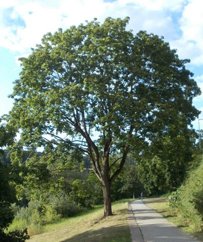 Spitzahorn (Acer platanoides) am Martinsufer, gehört zum Baumbestand am Moselradweg Trier, ausgezeichnet mit Plakette "Geschützter Landschaftsbestandteil". [1]