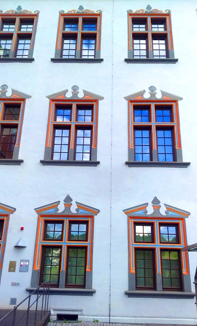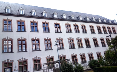 Ehemaliges Kurfürstl. Schloss. (aus der Renaissance-Zeit mit Rokoko-Flügel auf der Südseite).1756 beauftragt Johann Philipp von Walderdorff den Neumann-Schüler Johannes Seiz mit der Planung. Bildhauerische Gestaltung durch Ferdinand Tietz.