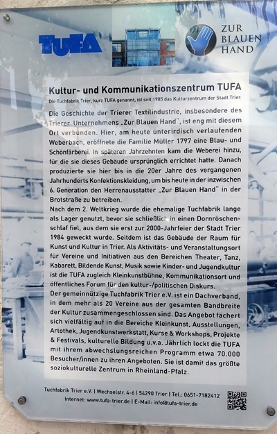 Die Geschichte der Trierer Textilindustrie, insbesondere des Trierer Unternehmens "Zur Blauen Hand", ist eng mit diesem Ort verbunden. Hier, am heute unterirdisch verlaufenden Weberbach, eröffnete die Familie Müller 1797 eine Blau- und Schönfärberei. In späteren Jahrzehnten kam die Weberei dazu, für die sie dieses Gebäude ursprünglich errichtet hatte. Danach produzierte sie hier bis in die 20er Jahre des vergangenen Jahrhunderts Konfektionskleidung, um bis heute in der inzwischen 6. Generation den Herrenausstatter "Zur Blauen Hand" in der Brotstraße zu betreiben.