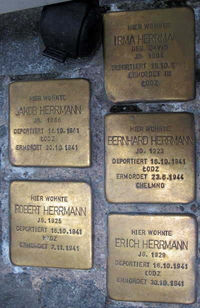 Vor der Neustraße 92 befinden sich 5 Stolpersteine für die Familie Herrmann, die allesamt am 16.10.1941 nach Łodz deportiert wurden und später an verschiedenen Orten ermordet wurden.