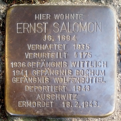 An dieser Stelle befinden sich insgesamt 2 Stolpersteine für Ernst und Leo Salomon (beide JG. 1894). Beide wurden nach §175 (Homosexualität) verurteilt.