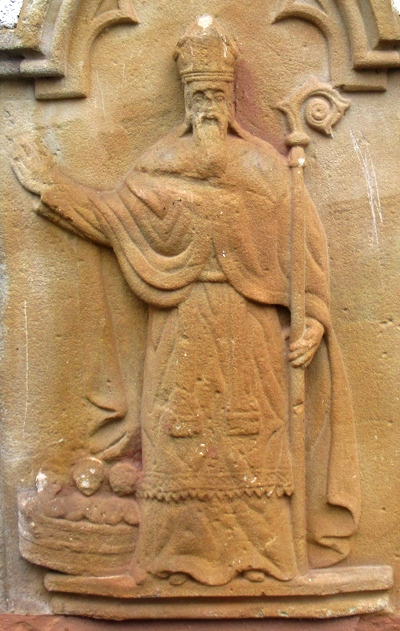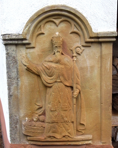 Kleines Sandsteinrelief, Abbildung eines Heiligen (Bischof) (?) direkt an Hauswand. [1]