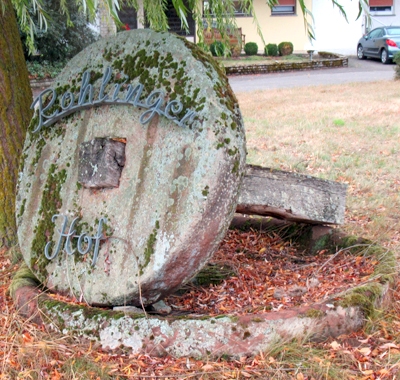 Alter Mühlstein mit gusseiserner Schriftverzierung ("Rohlinger Hof"). [1]