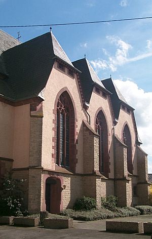 Ein hoher Sockel - er ist wie die Strebepfeiler unverputzt -, große, dreibahnige Maßwerkfenster und quergestellte Krüppelwalmdächer über jedem Seitenschiffjoch charakterisieren den Außenbau des Kirchenschiffs. Die bewußt asymmetrisch gestalteten Fassaden, ihr unterschiedliches Material (verputzte Wandflächen über solchen in Kalksteinsichtmauerwerk; Eckquaderungen, Portal- und Fensterrahmungen und Gesimse in rotem Sandstein) wollen malerisch wirken und sind typisch für die Architektur des späten Historismus um 1900.