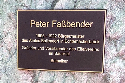Gedenkstein für Peter Fassbender, Bürgermeister in Echternacherbrück und gleichzeitig Amtsbürgermeister der Bürgermeisterei Bollendorf mit Sitz in Echternacherbrück (1896 - 1922).