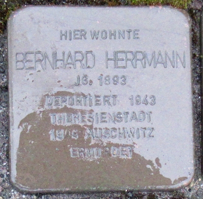 Fünf Stolpersteine für Auguste, Bernhard, Helmuth, Jenny und Rudi Herrmann auf dem Dorfplatz an der Trierer Straße. Die Familie wurde von den Nazis zwischen 1942 und 1944 deportiert und in Konzentrationslagern umgebracht. [1]