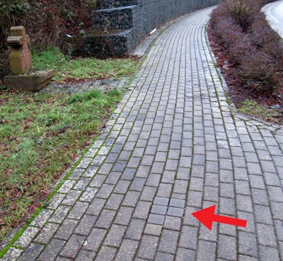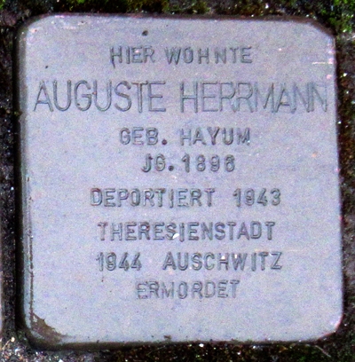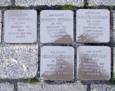 Fünf Stolpersteine für Auguste, Bernhard, Helmuth, Jenny und Rudi Herrmann auf dem Dorfplatz an der Trierer Straße. Die Familie wurde von den Nazis zwischen 1942 und 1944 deportiert und in Konzentrationslagern umgebracht. [1]