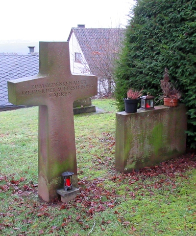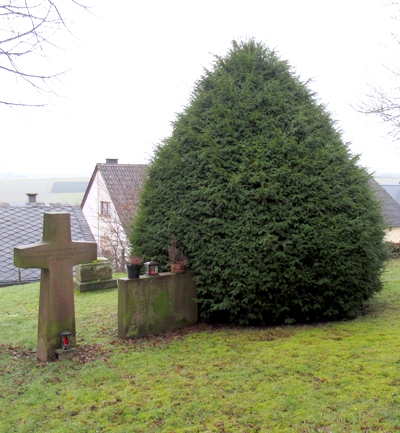 Hinter der Kirche St. Antonius, Pellingen, Ehrenmal mit Kreuz und Gedenkstein für die Gefallenen des 2. Weltkrieges.