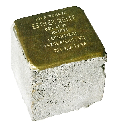 Der erste Trierer Stolperstein durfte 2005 nicht verlegt werden, weil der Privatigentümer es nicht erlaubte. Seither erinnert er im Stadtmuseum an Esther Wolff geb. Levy, die 1945 in Theresienstadt ums Leben kam. Mittlerweile liegen in Trier über 200 Stolpersteine, insgesamt sind es rund 70000. [3]