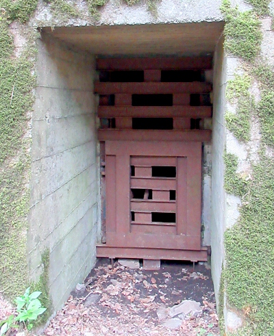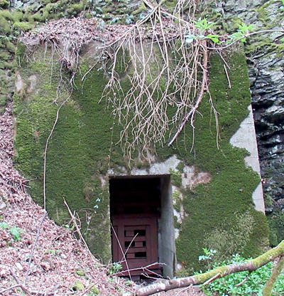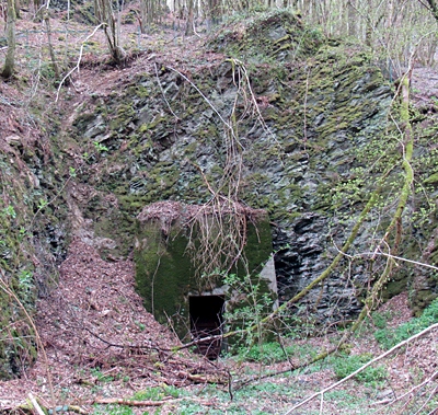 Eingang zu einem Westwall-Munitionsbunker/Stollen in der Felswand. Bezeichnet mit "Minimierte Anlage" [1]
