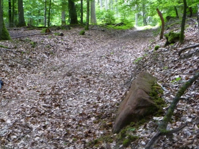 Auf Höhenpunkt 216.7 NHN. Der umgestürzte Wegweiser weist auf der Vorderseite die Richtung zum Drachenhaus. [1]