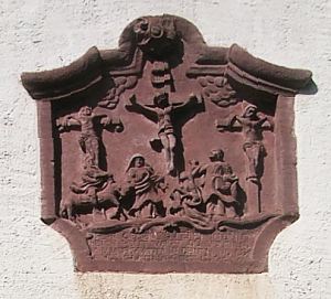 Vor dem Obertor. Aus dem 18. Jahrhundert zwei bäuerliche Steinfiguren und drei an der Kapelle eingemauerte Kreuzwegstationen.
