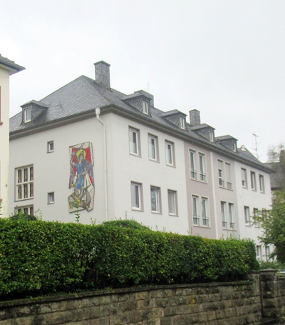 Ein ca. 3m hohes Glasmosaik des Trierer Glasmalers Jakob Schwarzkopf aus dem Jahre 1960, angefertigt an einer Hauswand Ostallee Ecke Gartenfeldstraße, zeigt den Erzengel Michael mit Schwert und Waage.