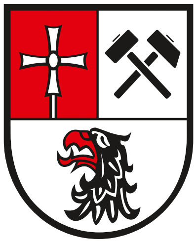 Im geteilten und oben gespaltenen Schild, vorn in Rot ein silbernes Vortragekreuz, hinten in Silber ein schwarzer Hammer mit Schlegel, unten in Silber ein schwarzer, rot bewehrter Adlerkopf.