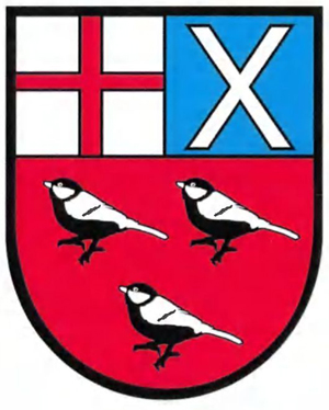 Unter einem gespaltenen Schildhaupt, in dem rechts oben in Silber ein rotes Balkenkreuz und links in Blau ein silbernes Andreaskreuz stehen, erscheinen in Rot, zwei zu eins, drei silberne Meisen.