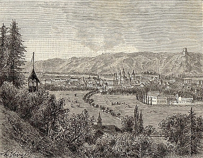 Bild 1: Stadtansicht von Trier (Nordost), Holzstich von Hubert Clerget: "Trèves - Vue générale", in: Victor Adolphe Malte-Brun, L` Allemagne illustrée. Géographie, Histoire, Administration, Statistique (Paris: Rouff 1885-1888). Maße: 110 mm x 140 mm.