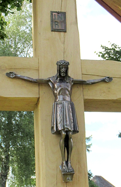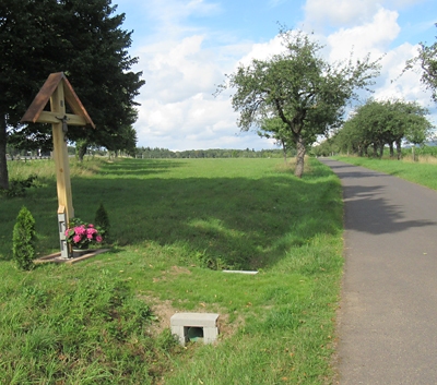 Holzkreuz mit Schutzdach, kleiner Korpus aus Messing, am Ende der "Apfelbaumallee", vor der Hauptstraße nach Gusenburg gelegen. [1]
