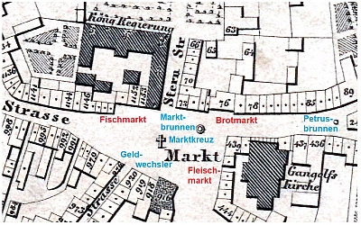 Für den täglichen Verkauf und für die Wochenmärkte, die dienstags und freitags stattfanden, hatten die Händler ihren festen Platz. Die Standplätze sind im Bild 1 (Auszug aus dem Stadtplan von 1832) eingezeichnet.