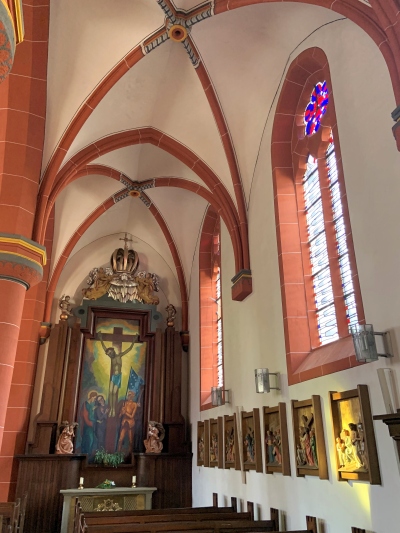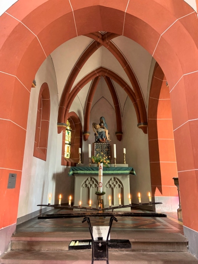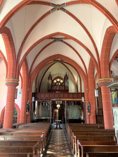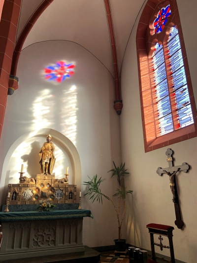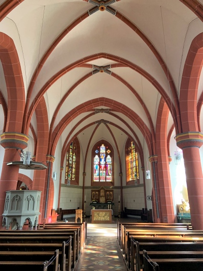1905-06 von Ernst Brand, Trier errichtet. Malerisch gruppierter Außenbau mit Zwerchgiebeln und quadratischem Flankenturm, bereichert durch Wichhäuschen in den Seitenmitten. [1]