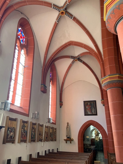 Neugotische dreischiffige Stufenhalle, 1905/06, Architekt Ernst Brand, Trier; Ausstattung; vor der Kirche spätbarocker Bildstock, bezeichnet 1788 [2]