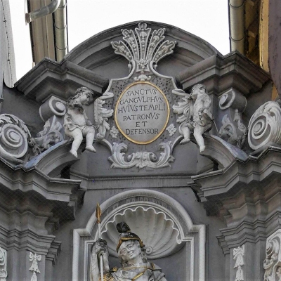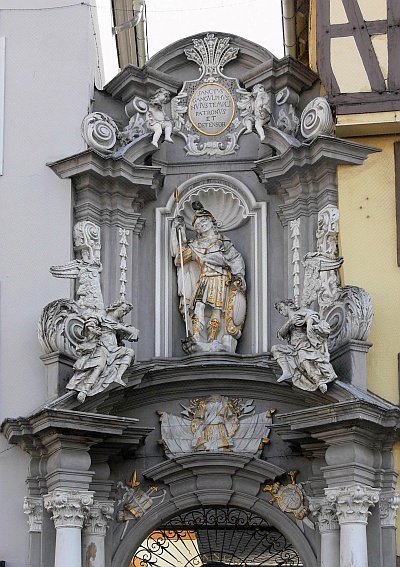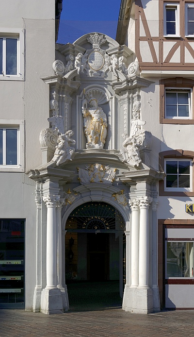 Hauptzugang der Kirche vom Markt aus und zugleich Eingang zu dem bis 1781 benutzten Friedhof der Pfarrei. Der Entwurf stammt von dem Baumeister und Augustinerbruder Joseph Walter, Steinmetz war Niclas Creising, Bildhauer Jacob Fische; das ursprüngliche Gitter schuf François Taffin. Um 1930 erfolgte eine intensive Renovierung (dabei wahrscheinlich Engel und Putten rekonstruiert oder durch Kopien ersetzt), 1983/84 Steinsanierung mit abschließender Farbfassung (weiß, grau, gold). [1]