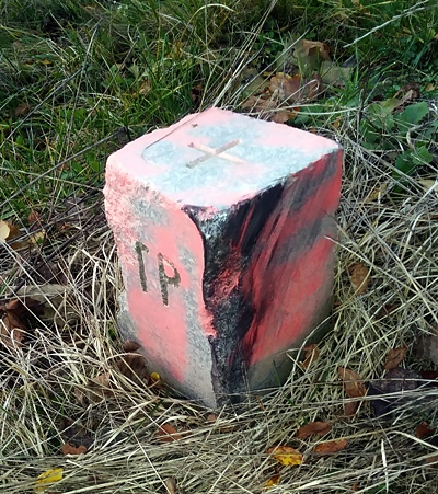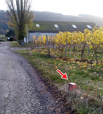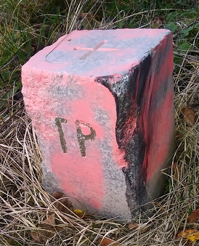 Topologischer Vermessungsfestpunkt am Wegesrand auf ca. 215m über NHN beim Falkensteinerhof. [1]