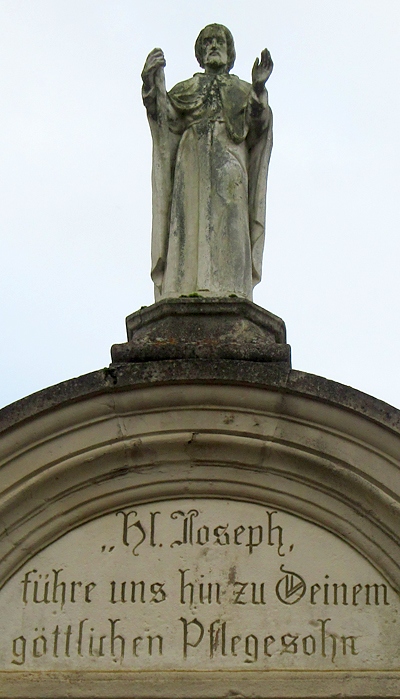 Der additiv zusammengefügte Baukörper in zwei Bauphasen anstelle der Vorgängerkirche 1848/49 und 1912 entstanden. Der 1848 erbaute Saalbau unter Satteldach und angesetztem, eingezogenem einachsigem Chor mit Dreiachtelschluß bezog den Turm der Vorgängerkirche ein. Ihn ersetzte 1912 eine stolze Doppelturmfassade nach Plänen von Architekt Adam Rüppel. Zwischen Langhaus und Chor wurde ein runder Treppenturm mit Haubendach eingestellt. Gleichzeitig wurde die straßenseitige Umbauung für die freie Sicht der Kirche abgebrochen, der Friedhof erweitert und eine Treppenanlage gebaut. Auftakt ist die im geschweiften Aufbau geschlossene Mauerpforte mit Widmung an den heiligen Josef und bekrönender Josefstatue; das Eisengitter ist original.