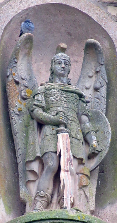 Die 1848 im zeitgemäßen, jedoch zurückhaltenden Rundbogenstil erbaute Kirche mit vor das Schiff gestellten Doppeltürmen, dazwischen eine Erdgeschossige Arkade mit aufliegendem Altan. Im Giebelfeld der Kirchenfassade eine von breiter Rahmung umfangene Nische mit Standbild des Erzengels Michael, 1912 zugefügt. Die Türme sind in den drei unteren Geschossen kubisch geschlossen, die Glockegeschosse achteckig, darüber welsche Hauben mit Pyramidenhelmen über den Laternen.