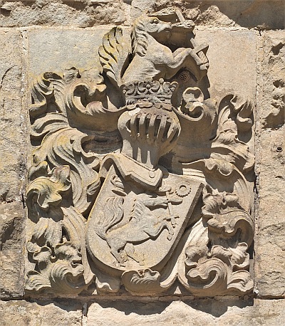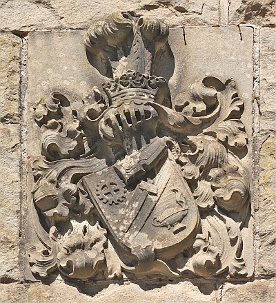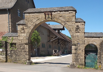 Einfahrt zum 1909/10 erbauten, 1945 kriegszerstörten Hofgut Grünhaus. Mit den Wappen von Schubert und von Stumm gezierter Werksteinbogen oberhalb Schloß Grünhaus. [1]