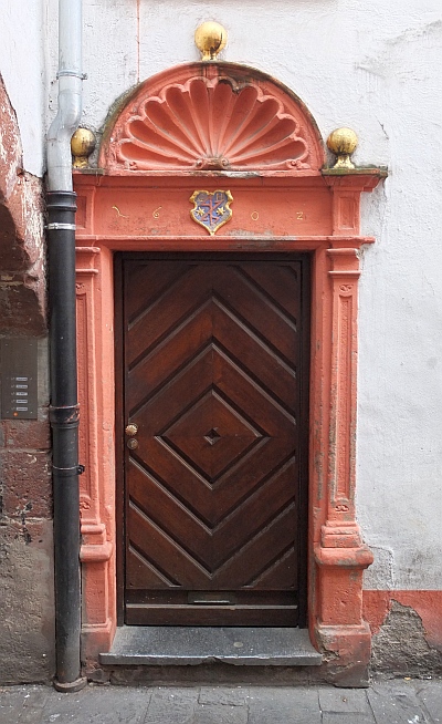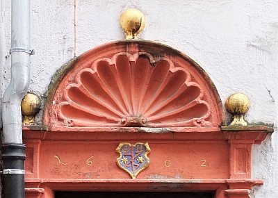 Hausmarkenwappen mit den Initialen C H und dem Baudatum 1602. Portalabschluss bildet ein muschelverzierter Rundbogengiebel mit Kugelaufsätzen. [1]